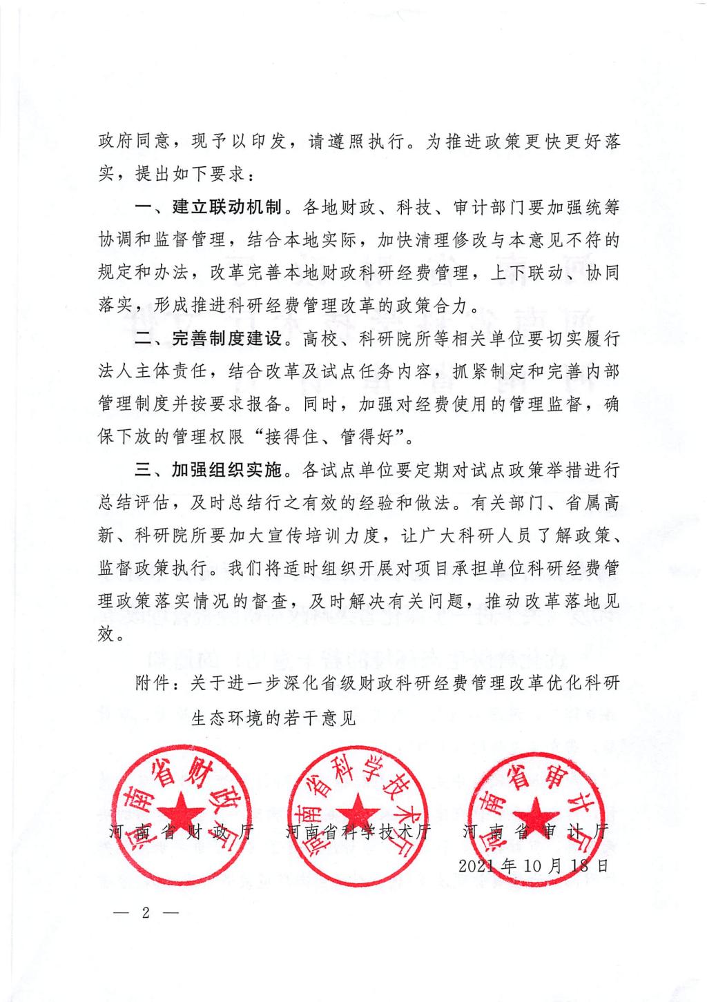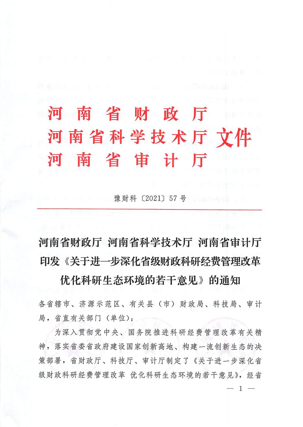 河南省财政厅 河南省科学技术厅 河南省审计厅印发《关于进一步深化省级财政科研经费管理改革优化科研生态环境的若干意见》的通知(豫财科〔2021〕57号).pdf