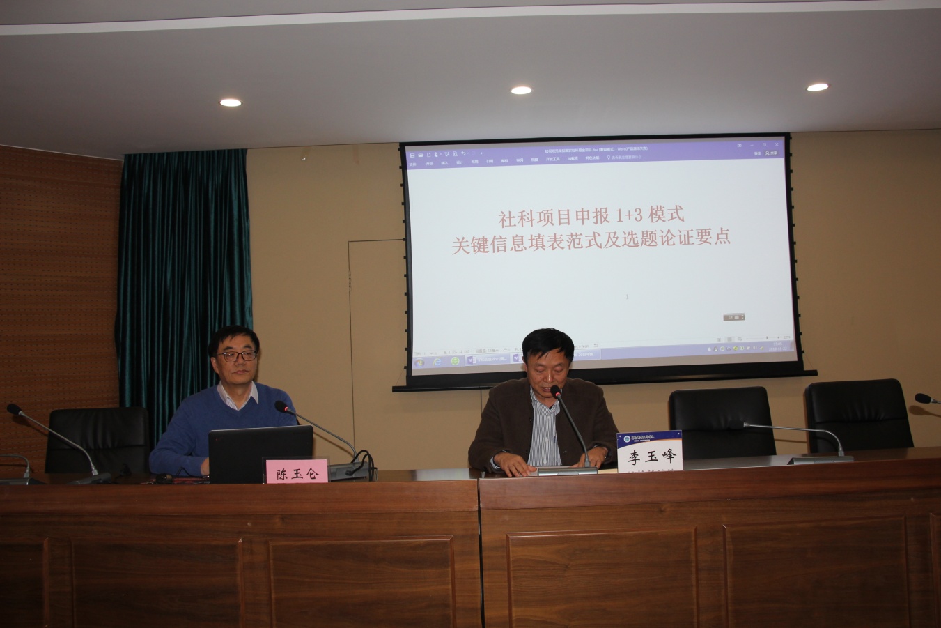 11月22日我院特聘专家、国家社科基金申报管理资深专家、中共中央党校科研部陈玉仑教授应邀来我校,并在行政楼二楼238会议室作了题为“社科项目申报1+3模式关键信息填表范式及选题论证要点”的专题讲座,会议由学校副校长李玉峰主持。