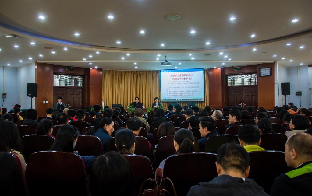 陈玉仑教授根据多年分管中央国家机关在京各单位国家社科基金项目申报管理及组织评审工作的经验,结合高校实际和国家社科基金项目近年来申报情况,详细解读了2017年国家社科基金年度项目立项情况、实施过程、评审关注点,以及国家社科基金项目和教育部人文社科项目设置申报规律、条件、要求和重要信息提要。结合已成功申报项目的范例,他详细阐述了国家社科基金项目分类、申报人员条件、申报要点、《申请书》填写范式、《活页》填写范式、如何选题、如何提炼选题、如何论证以及申报其他注意事项等内容。在长达近7个小时的讲座中,陈玉仑教授的讲解厘清了教师们课题申报的模糊认识,解决了教师们申报书填写过程中存在的实际问题,增强了老师们申报国家社科基金项目的信心。