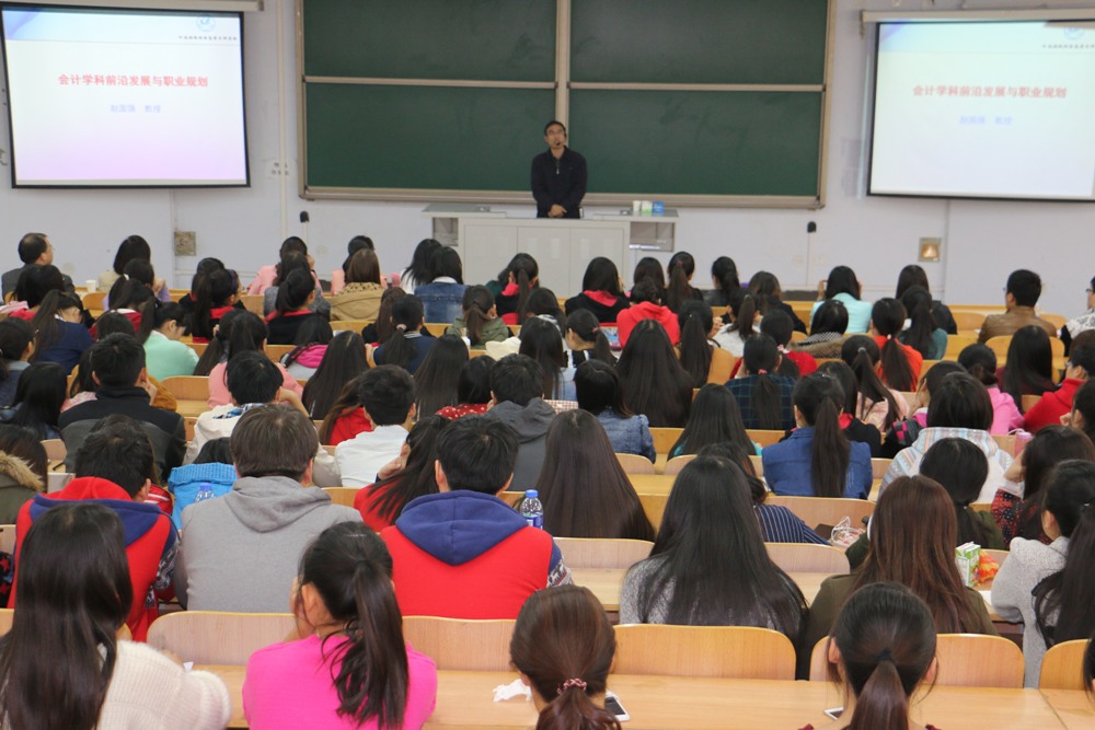 讲座上,赵国强教授首先以幽默风趣的语言,通俗易懂地描述了目前我国会计准则与国际会计准则的关系及会计准则造成的“经济后果”。随后,他从会计观、经济观和企业观等三个视角详细解读了“会计”的内涵及学习方法,分析了我国会计准则持续国际趋同的现状,让与会师生打开了研究、学习会计专业知识的视野。他提出要把握住会计准则的“一个目标、一个主线、一个谨慎、一个强调”和“确认、计量、报告”等“四个一,六个字”的原则,指出会计工作者要具备“做精做专、做深做广”等素质和能力。最后,他又分析了当前我国会计职业初级会计师供大于求,中高级会计师供不应求的现状,预测我国今后10年最需要的人才是会计师。他还勉励处在“变革的时代、创新的时代、挑战自我的时代”的同学们,不要浮躁,在校期间静下心来学会学习、学会做人、学会做事、学会与人共处。