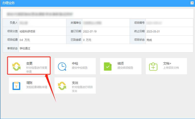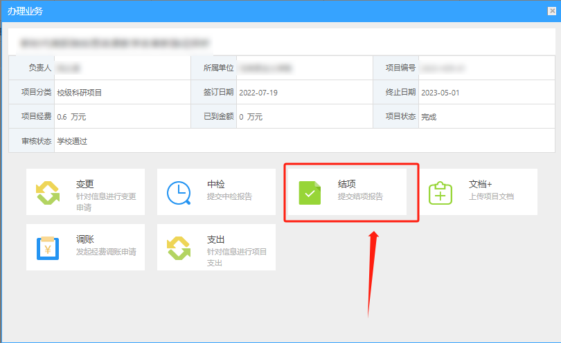 八、如无需进行项目变更,直接点击“办理业务”中的“结项”进行操作。如进行了项目变更,待审核通过后点击“结项”进行操作。
