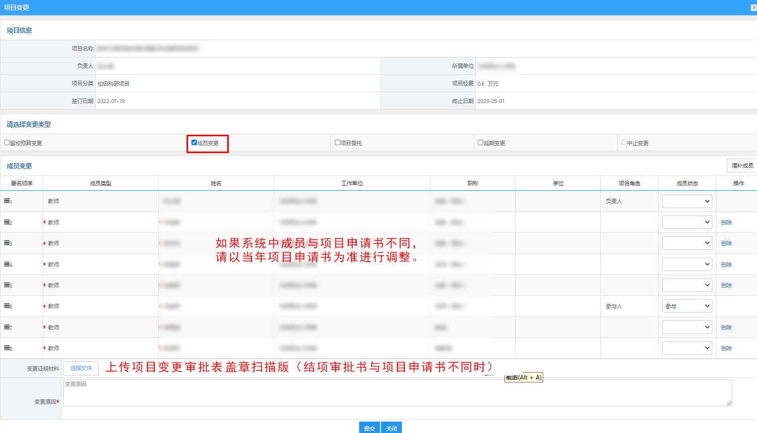 七、如项目成员变更,点击“变更”进行操作(如果项目申报时系统成员与上报的项目申请书中的成员不同时,也在此处调整变更,须告知科技开发处校级科研项目负责人员)。