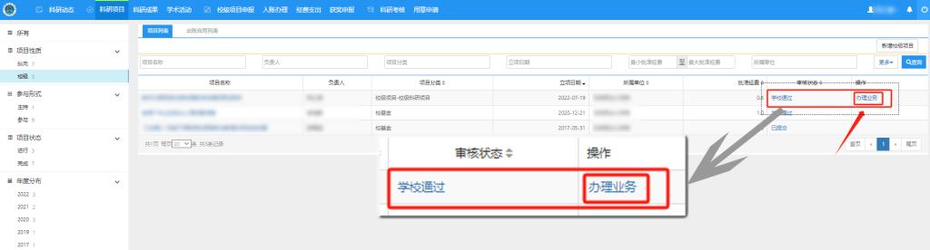 六、返回列表,等待审核状态为“学校通过”后,点击办理业务。