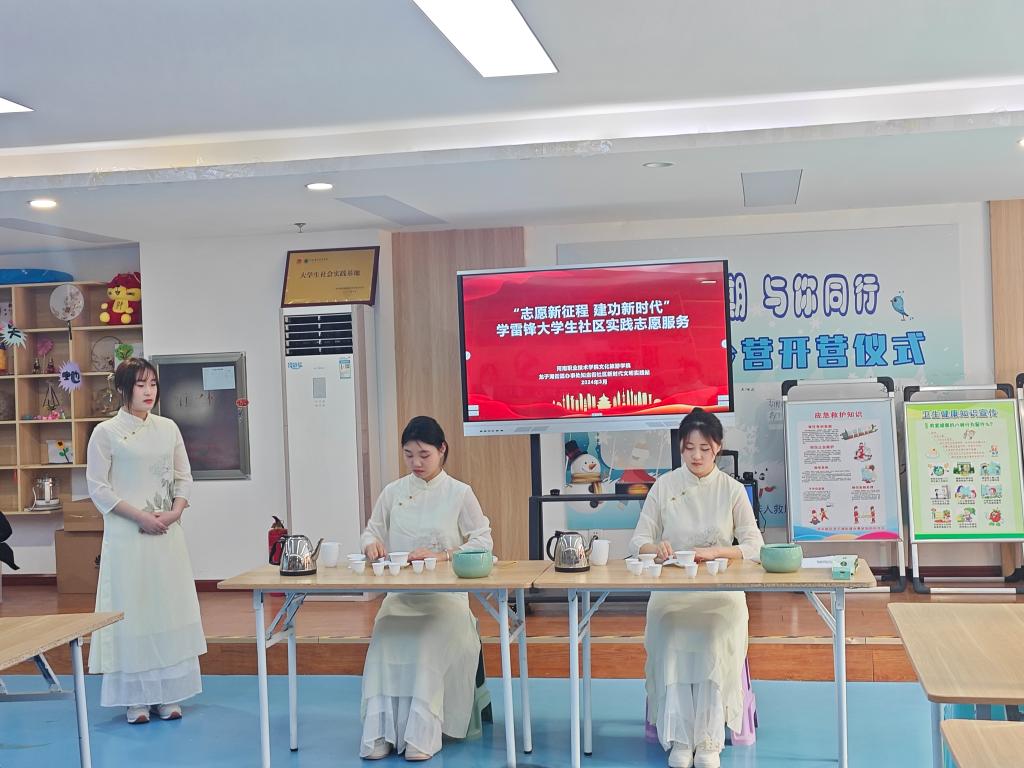 师生志愿者给社区居民带来了茶文化知识讲解、茶艺、歌舞和快板等文艺表演,王莹老师首先向大家介绍了茶的品类、不同茶叶冲泡的技巧。我院茶艺社刘晨、杨尊一、孙景新三位同学为大家献上精彩的茶艺表演,他们手法娴熟、细致入微,杯中的茶叶浮浮沉沉,活动现场茶香弥漫。现场居民热烈分享自己的品茶心得,积极和老师交流饮茶的乐趣和养生效果。