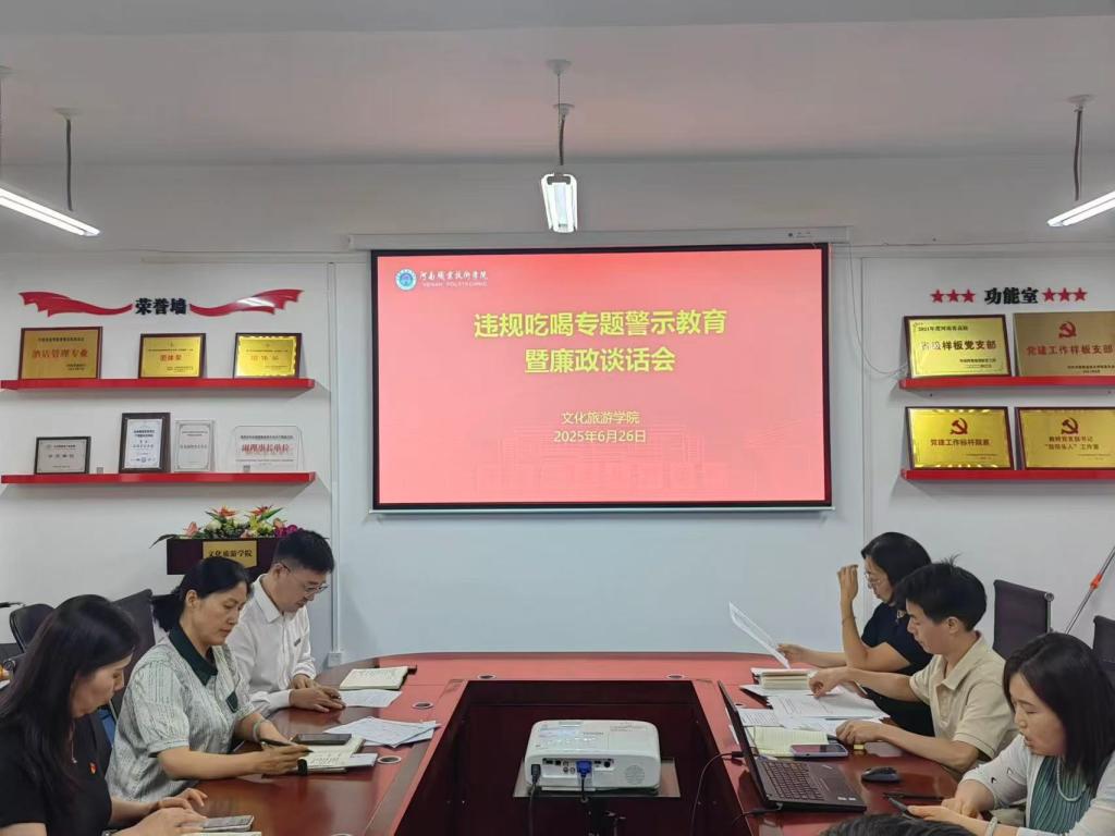 为深入贯彻落实全面从严治党要求,切实增强全体教职工廉洁自律意识和拒腐防变能力,6月26日下午,文化旅游学院召开违规吃喝专题警示教育暨廉政谈话会。学院领导班子成员及全体教师参加会议,会议由院长陈佳平主持。