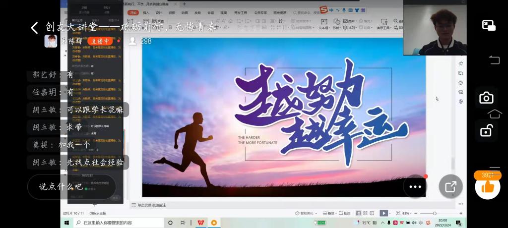 为大力弘扬创新创业精神,引领在校大学生创新创业,充分发挥校友创业示范带动作用,3月24日晚上19:30分,我院通过钉钉直播的方式在线上召开创友大讲堂。此次讲座邀请了我院创业校友宋陈辉作为主讲人,我院2021级全体学生参加了此次活动。