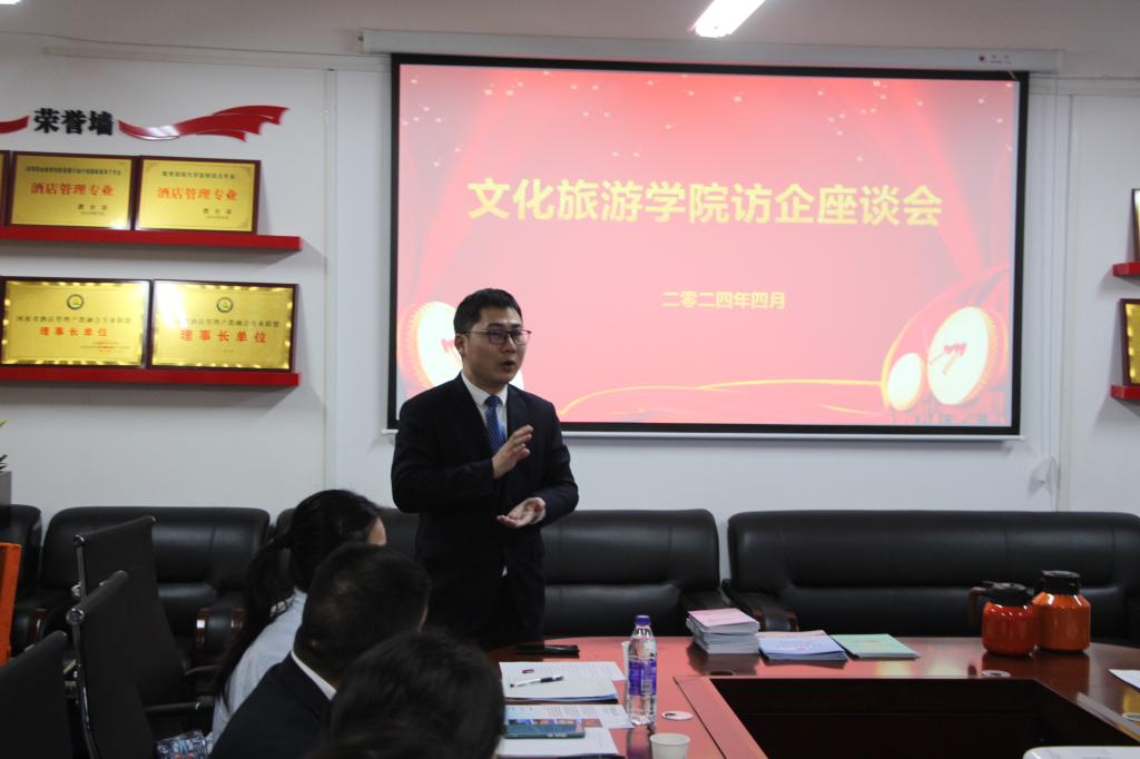 陈佳平院长对到访企业表示热烈的欢迎,介绍了文旅学院的发展概况、专业特色及所获成绩。他指出,校企深度合作,共建就业平台,对学院的长足发展和育人工作至关重要,希望企业代表能为文旅学院的人才培养提出宝贵意见和建议。