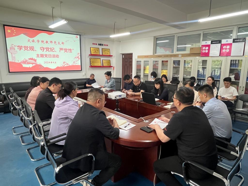 为深入学习贯彻修订后的《中国共产党纪律处分条例》(新修订),文旅学院教师党支部结合学习党章党规党纪和《中国共产党纪律处分条例》专题学习要求,于2024年4月28日在笃行楼630会议室围绕《中国共产党纪律处分条例》的解读,开展“学党规、守党纪、严党性”主题党日活动。