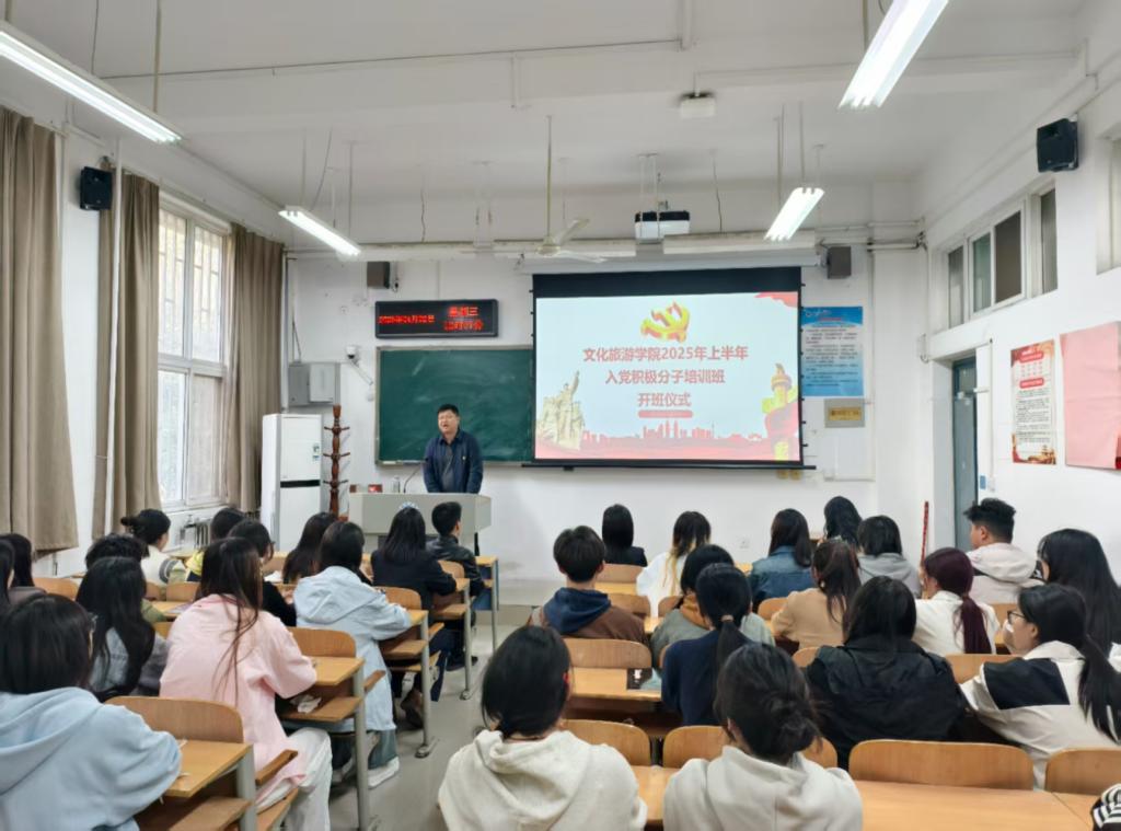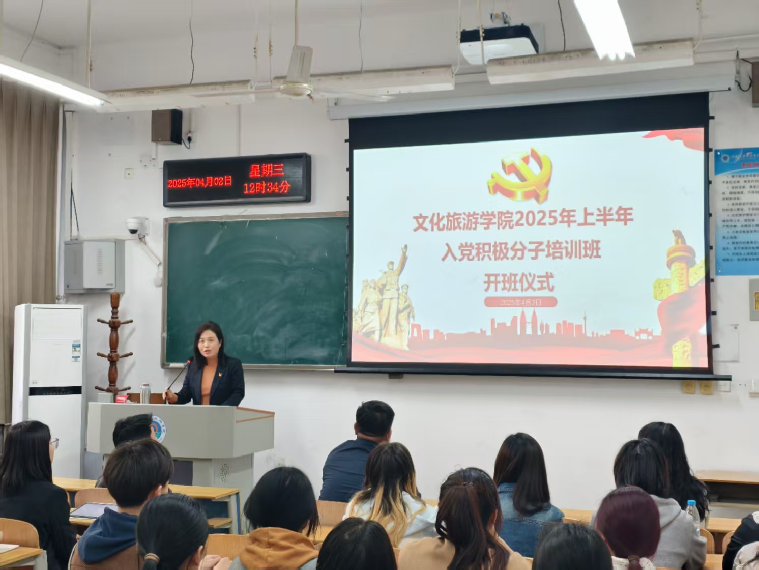 为切实做好党员发展工作,进一步提升入党积极分子的政治素养与理论水平,加强入党积极分子的教育培养,4月2日中午,文化旅游学院在2105教室举行2025年上半年入党积极分子培训班开班仪式。学院党总支书记苏威、学生党支部书记敬璐、学生党支部委员出席会仪,会议由学生党支部书记敬璐主持。