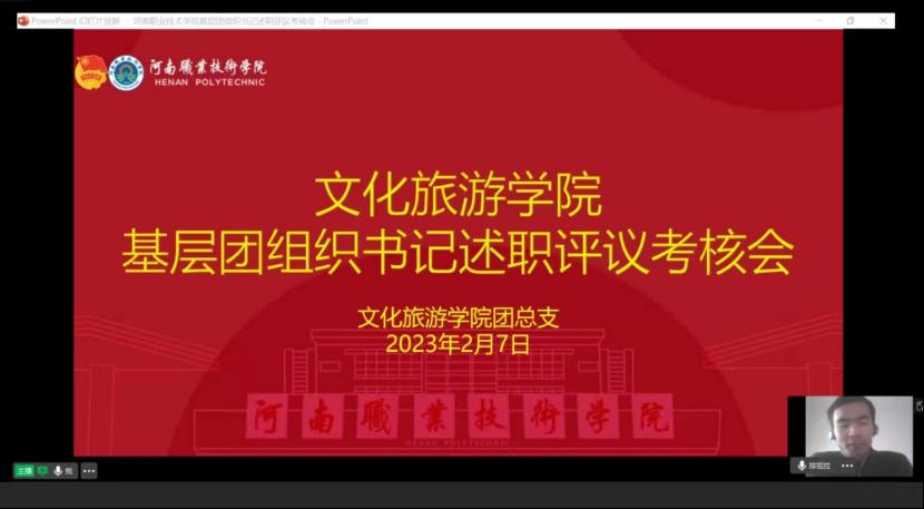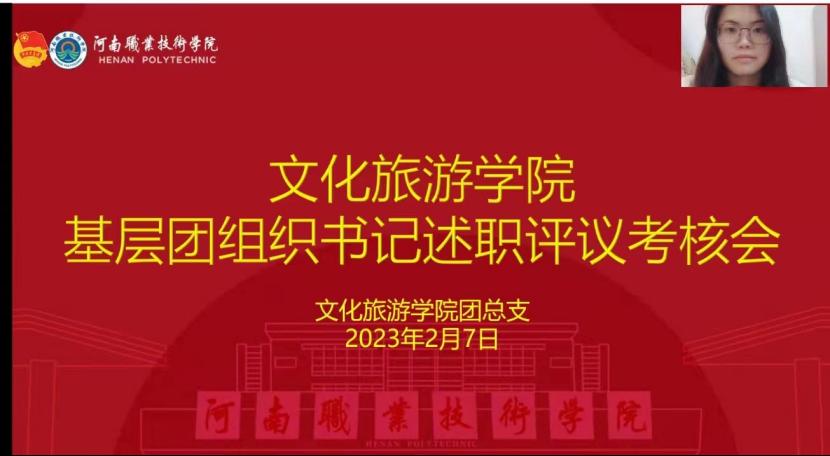 为贯彻落实团中央《关于印发<基层团组织书记述职评议考核暂行办法>的通知》和全面从严治团要求,激发基层团组织活力,提高工作成效,2月7日下午3点,文化旅游学院团总支通过线上钉钉会议形式组织各班级团支书开展述职评议工作。会议由院学生会组织部主持,院团总支工作负责人敬璐老师参加了会议。