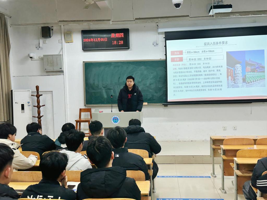 为增强学生的国防意识,激发学生的爱国热情和参军报国意愿,2024年12月5日下午,文化旅游学院团总支在明理楼1105教室成功举办征兵动员宣讲活动。此次活动邀请我院优秀退役士兵代表娄迅作为主讲人,学院2023级、2024级全体在校男生参加讲座。