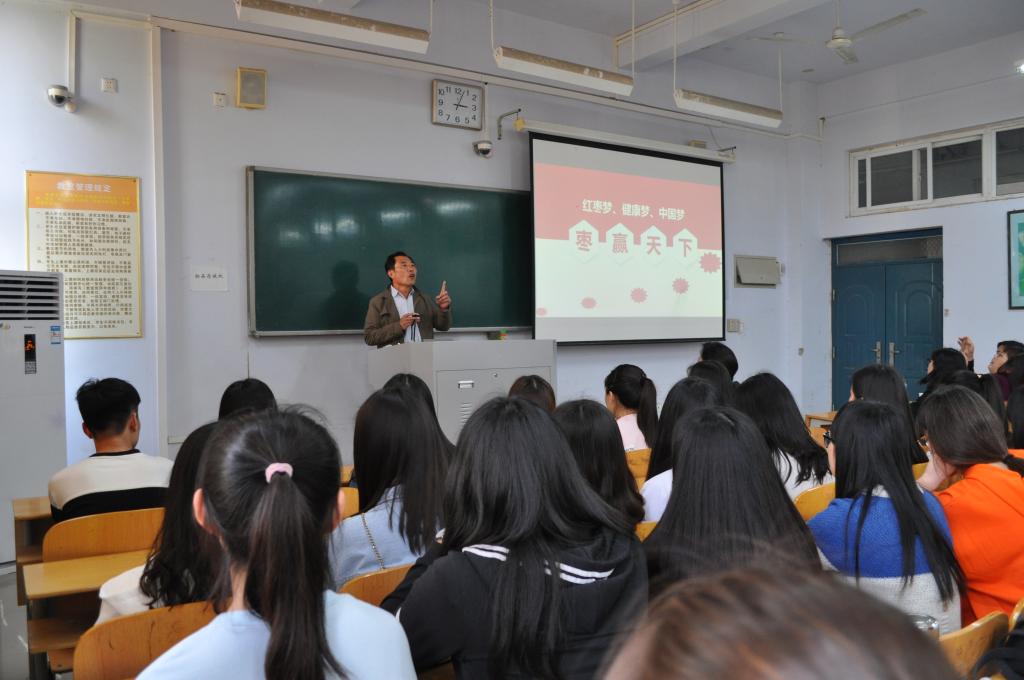 报告会上,王新才教授从红枣品种、红枣加工、红枣养生等方面,对枣产品系列研发流程及研发项目管理进行了深入的讲解。整场报告会气氛活跃,受到师生的热烈欢迎。