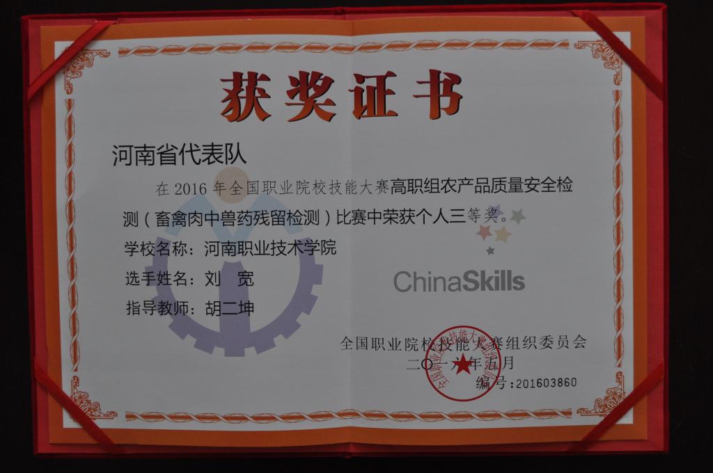 在刚刚结束的全国职业院校技能大赛(高职组)“农产品质量安全检测大赛”中,我院2013级食品加工技术专业参赛选手刘宽,取得“畜禽肉中氟喹喏酮类兽药残留测定项目”三等奖的优异成绩,为我系参加全国职业技能大赛又增添一枚奖牌。这也是我省参加此项比赛以来的首次获奖。