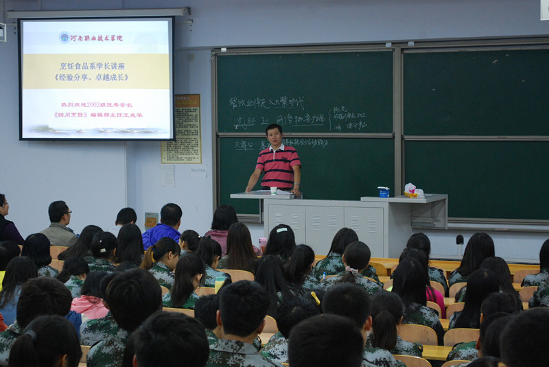 王兆华同学是我系2002级烹饪工艺与营养优秀毕业生,现任职于《四川烹饪》杂志社编辑部主任。在讲座中,他结合自己在校期间的学习和毕业后的择业、就业经历,从如何进行人生定位、职业价值取向、知识储备和根据专业兴趣培养良好习惯等方面与同学们进行分享。鼓励同学们既要脚踏实地,又要勇于创新、接受挑战、增长才干。并期望学弟学妹们在校期间,要扎实学好自己的专业知识与技能,努力培养自身的特长,提高社会适应能力。
