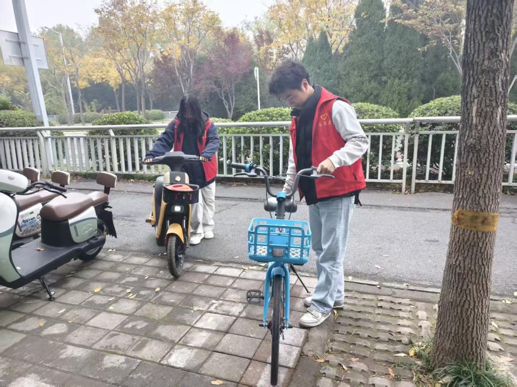 活动开始前,志愿服务部陈时杰进行了简短动员,明确了活动意义、任务分工及安全注意事项。志愿者们身着统一志愿服装,精神饱满,迅速投入到志愿服务中。活动区域主要覆盖学校东门南、地铁口以及相邻市政道路的非机动车停放点。这些区域人流量、车流量大,共享单车使用频繁,容易出现乱停乱放、堵塞通道等现象。志愿者们分工协作,默契配合。他们耐心地将道路旁、绿化带边、人行道中央随意停放的共享单车一一扶正,并将其整齐摆放到划定的非机动车停车区域内,确保车头朝向一致,车辆排列有序。对于正在停放或取用单车的同学和市民,志愿者们也主动上前,进行文明引导和温馨提示,宣传“文明共享、规范停放”的理念,倡导大家自觉维护公共秩序,做文明出行的践行者和守护者。