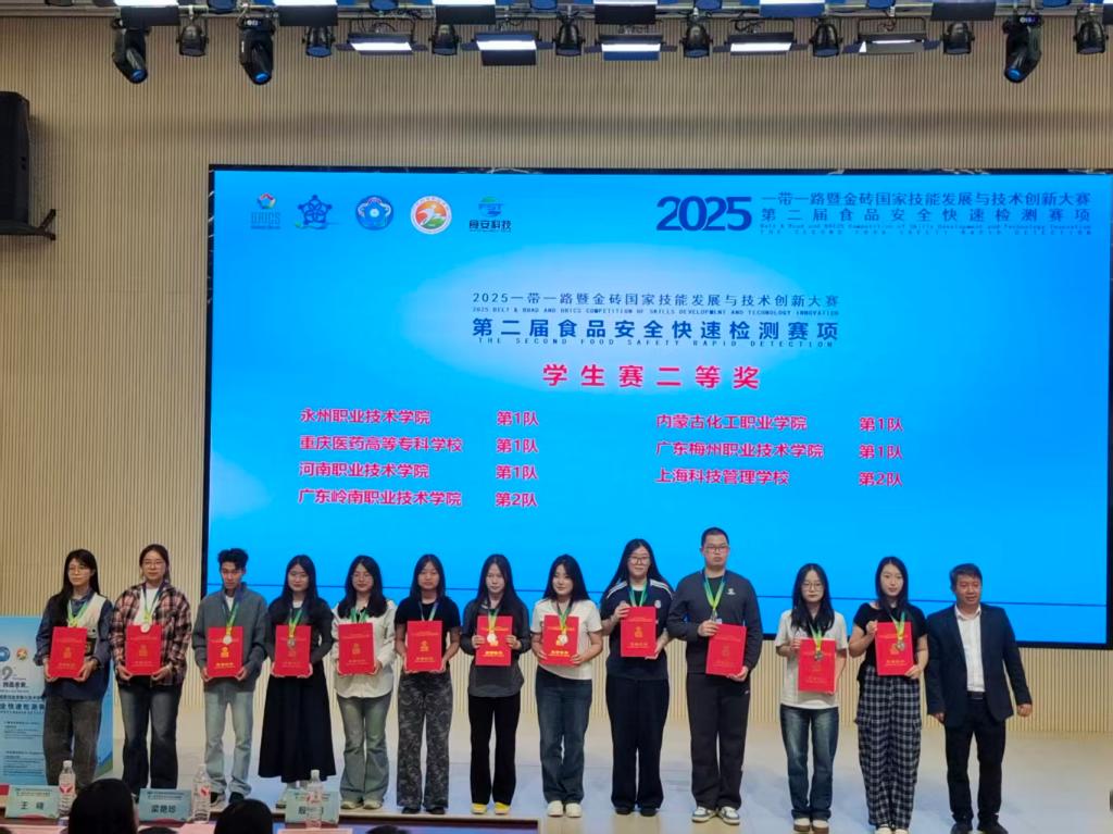 近日,2025“一带一路”暨金砖国家技能发展与技术创新大赛第二届食品安全快速检测赛项全国总决赛在广东科贸职业学院圆满落幕。食品工程学院学生团队凭借扎实的专业基础、规范的操作技能和出色的临场发挥,从全国75所院校的500余名参赛选手中脱颖而出,勇夺一金一银,充分展现了学院在食品质量与安全领域的教学实力和人才培养成效。