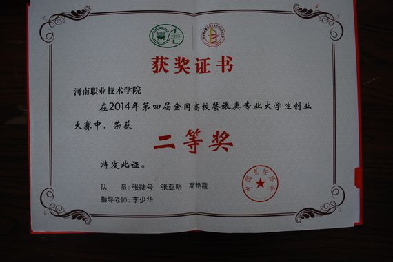 第四届全国高校餐旅类专业大学生创业大赛二等奖