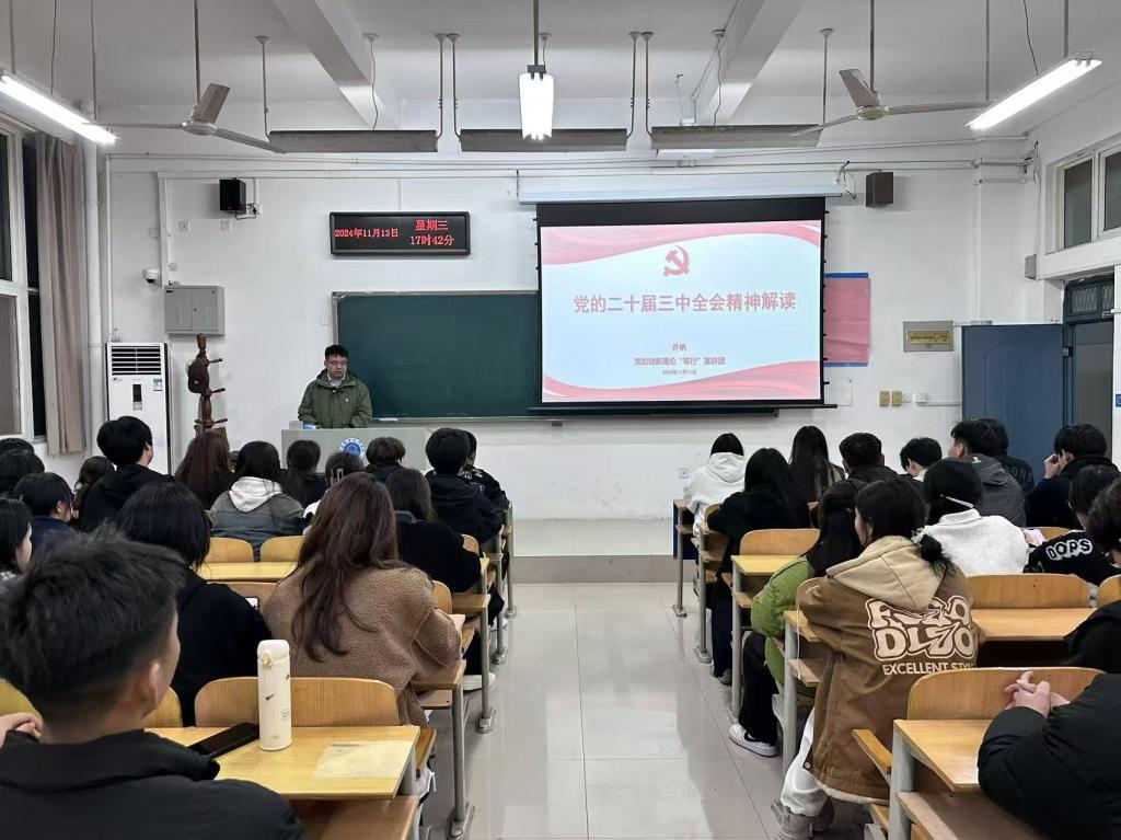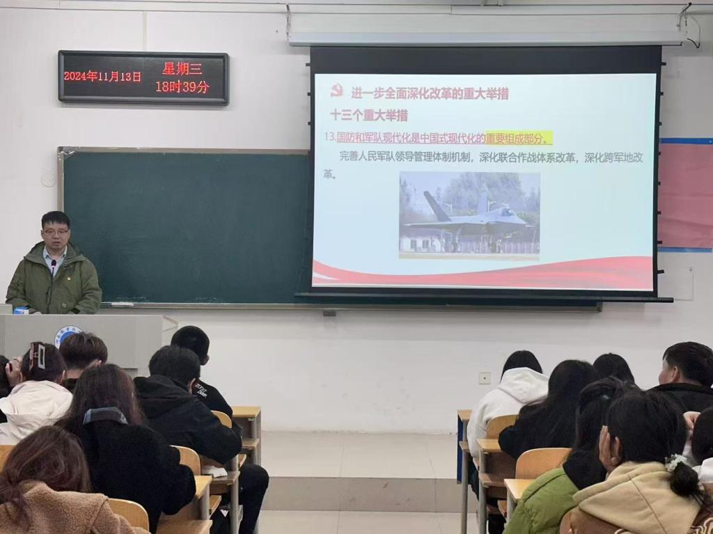 根据校党委统一部署,11月13日晚,河南职业技术学院党的创新理论“笃行”宣讲团四级宣讲员、智慧健康学院团总支书记(学工办主任)乔帆在2107教室以《凝心聚力共发展,挺膺担当筑未来》为题开展党的二十届三中全会精神宣讲。智慧健康学院学生党支部师生党员、入党积极分子、学生会骨干及各级班团干部参加了宣讲会。