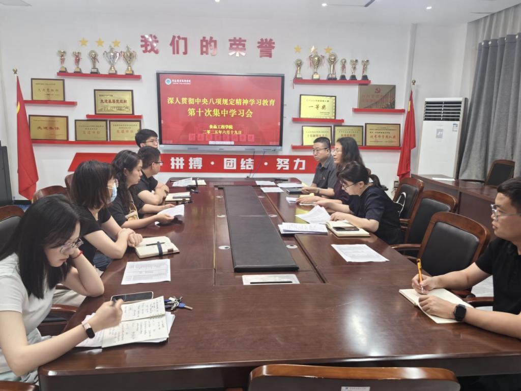 6月19日下午,食品工程学院党总支于学院109会议室开展深入贯彻中央八项规定精神学习教育第十次集中学习。此次会议由党总支书记王延东主持,全体党员教师参会。