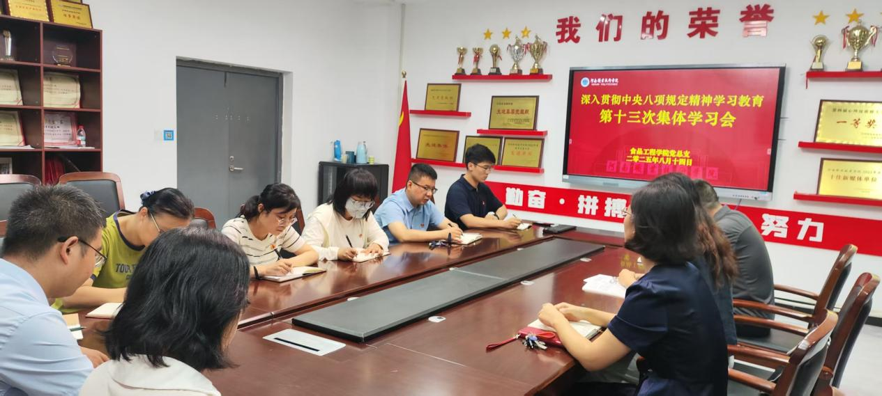 8月14日下午,食品工程学院在健行楼109党建活动室开展第十三次集中学习活动。党总支书记王延东主持会议,全体党员同志参会。