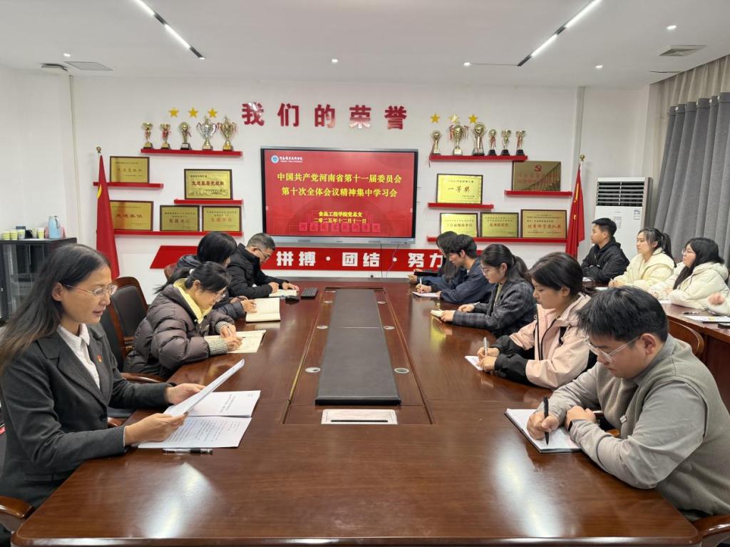12月11日下午,食品工程学院党总支在109会议室组织开展中国共产党河南省第十一届委员会第十次全体会议精神集中学习会。学院党总支书记王延东主持会议,全体党员教师参会。