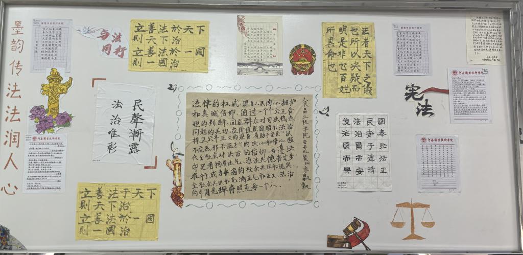 为深化“一站式”学生社区法治文化建设,弘扬法治精神,打造法治生态育人新阵地,3月17日—23日食品工程学院团总支依托“一站式”学生社区,组织开展“墨韵传法,法润人心”法治宣传教育书法活动。