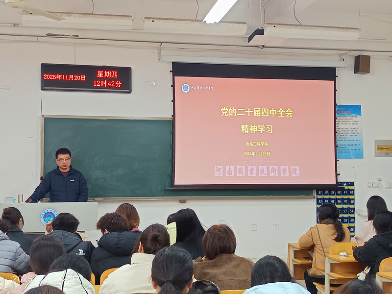 为充分发挥“一站式”学生社区育人实效,切实提升青年学生骨干的理论素养与思想认同,11月20日中午,食品工程学院第七期“青年马克思主义者培养工程”在2108教室组织开展首次理论学习课,专题学习党的二十届四中全会精神。本次学习由学院团总支书记乔帆主持并担任主讲。