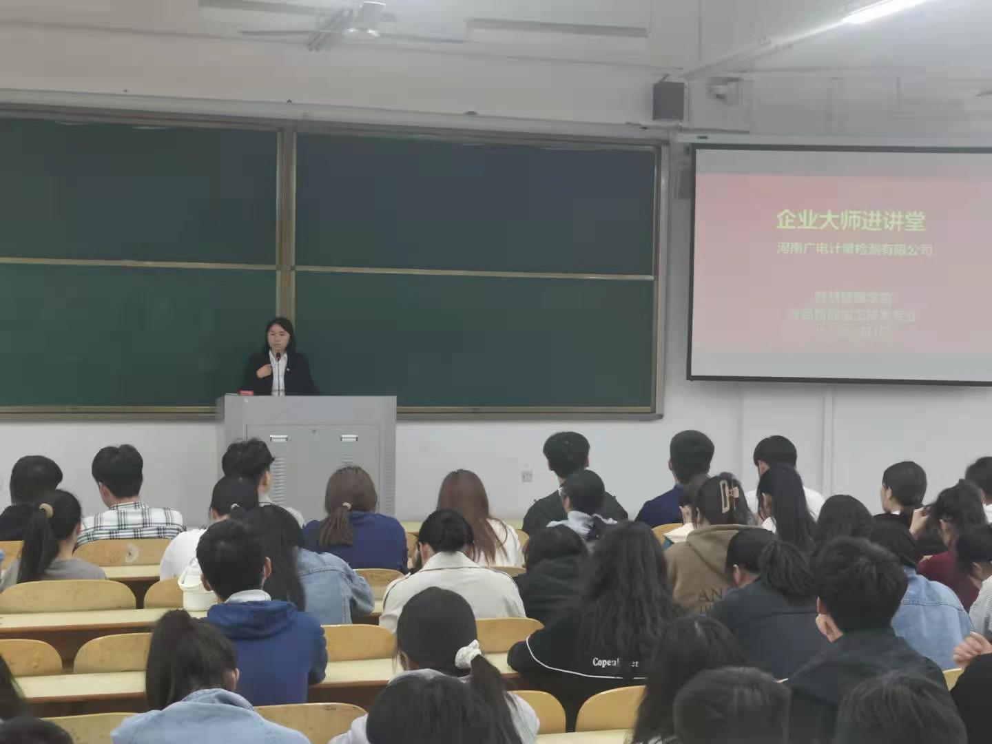 为培养合格的应用型技能人才,促进学生零距离就业,智慧健康学院开展企业大师进课堂之系列活动。2023年5月4日下午,智慧健康学院邀请河南广电计量检测股份有限公司总经理孙若男,实验室主人陈涛伟为我院食品智能加工技术专业师生进行“第三方检测行业发展及未来趋势”的专题讲座。讲座在1201教室举行,由院长胡二坤主持,教研室主任段飞、食品智能加工技术专业21级、22级学生参加了讲座。