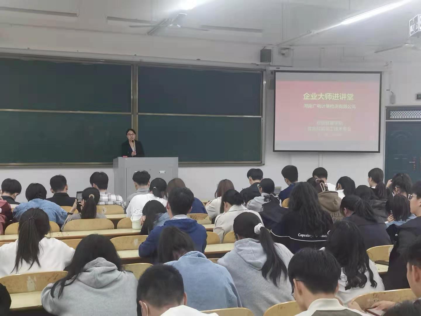 首先,孙若男围绕第三方检测行业发展现状和前景、河南广电计量检测股份有限公司的企业发展历程、经营范围和主要业务等方面进行了详细地讲解,向同学们介绍了行业内最前沿的检测技术和方法,激发了同学们投身检测行业的学习热情。其次,陈涛伟详尽介绍了岗位实习的工作环境、实习内容、实习方式、薪资待遇及员工转正要求等内容。