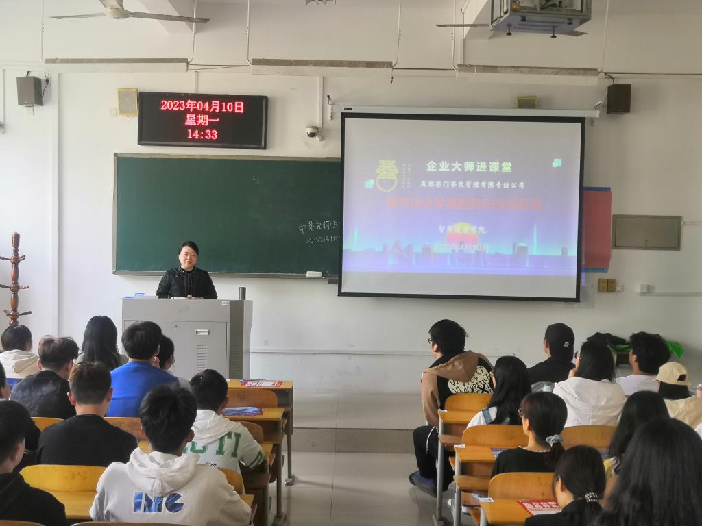 2023年4月10日下午,智慧健康学院“企业大师进课堂”活动第五讲在明理楼1203教室举行,特邀成都柴门餐饮管理有限责任公司人力资源部谢国燕总监就餐饮企业发展趋势和连锁经营做专题讲座。烹调工艺与营养专业和中西面点工艺专业2021级学生参会,会议由烹饪工艺与营养专业专职教师程志江主持。