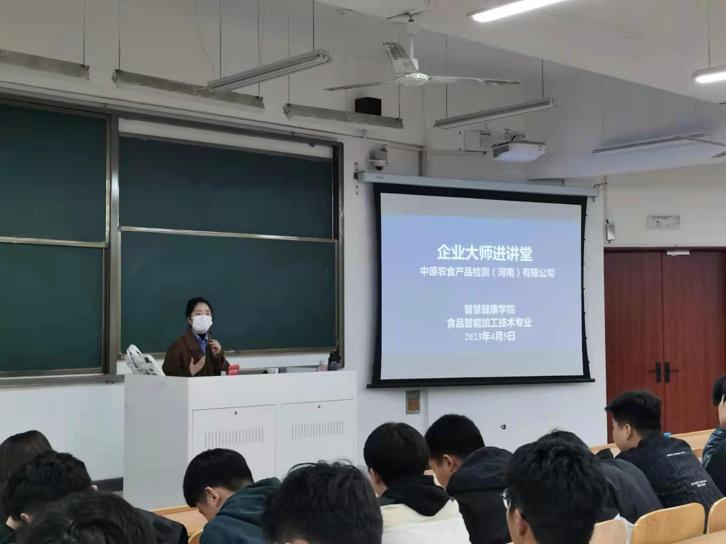 为零距离对接行业需求,培养合格应用型技能人才,智慧健康学院开展了企业大师进课堂系列活动。2023年4月5日晚上,邀请中原农食产品检测(河南)有限人事杨婉莹和陈新宜为食品智能加工技术专业师生开展“我国检测行业现状及发展趋势”专题讲座。讲座在3105教室举行,教研室主任段飞主持,食品智能加工技术专业21级、22级学生聆听了讲座。