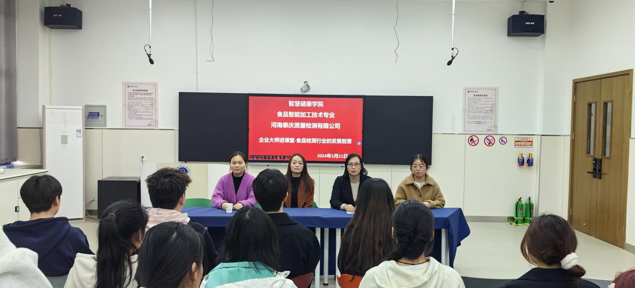 为进一步深化产教融合协同育人,增强学生对食品检测行业的深入了解,3月21日下午,智慧健康学院举办“企业大师进课堂”系列活动第一讲,邀请河南泰庆质量检测有限公司人力总监黄素珍一行开展“食品检测行业发展前景展望”专题讲座。会议在合鼎楼902举行,食品智能加工技术专业教研室主任段飞主持,教研室全体人员、食品智能加工技术专业22级全体学生参会。