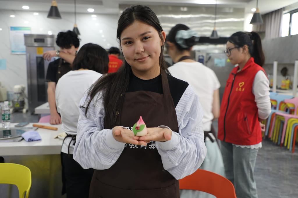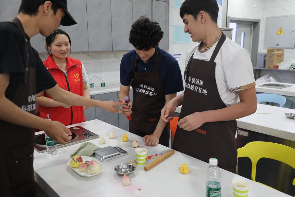 最令人期待的亲手制作环节,留学生在科普专员的耐心示范和指导下,纷纷化身“面点小匠人”。大家兴致勃勃地揉捏面团,尝试塑造属于自己的“寿桃”与“福袋”。活动现场气氛热烈:有人专注塑造寿桃的圆润饱满,有人精心雕琢福袋的褶皱系带。指尖上面团的舞动,成为跨越语言的文化交流媒介。每件作品都融入了留学生对中国非物质文化遗产的理解与热情。