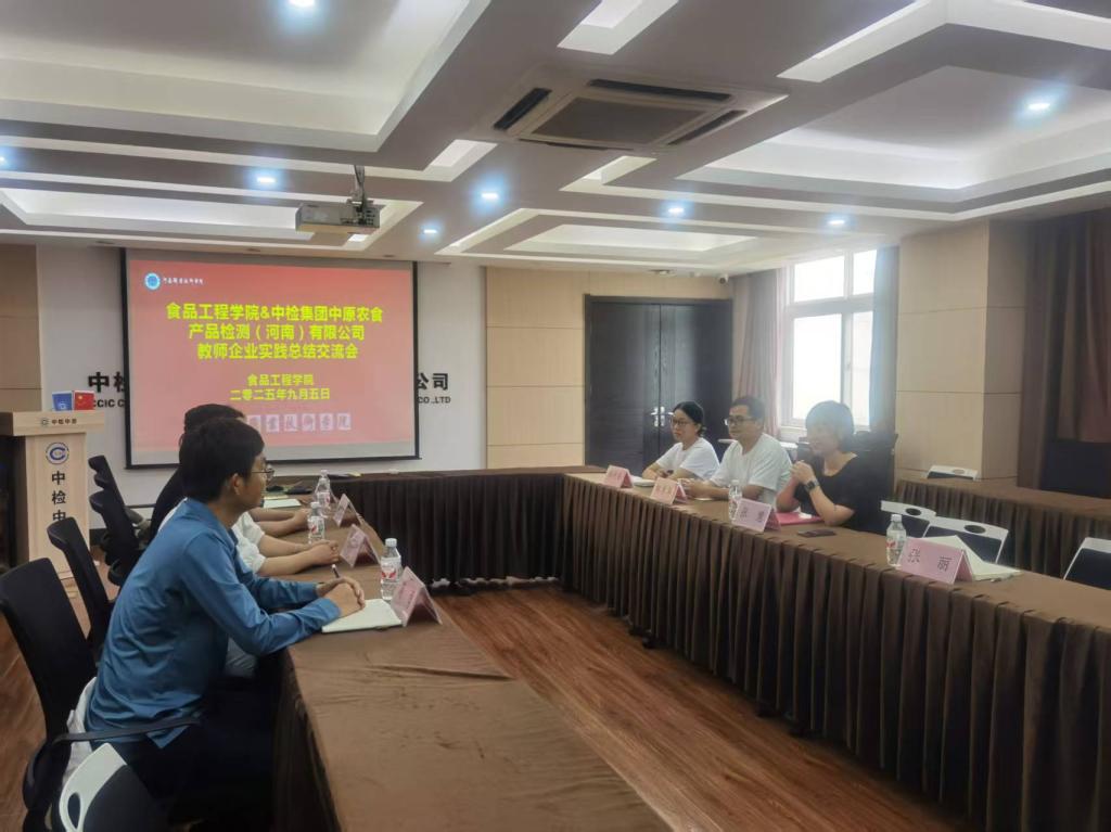 9月5日下午,食品工程学院院长胡二坤带领食品智能加工技术专业教研室主任崔萌甜、食品营养与健康专业教研室主任尚益民及满勇博士,赴中检集团中原农食产品检测(河南)有限公司召开教师企业实践总结交流会。中检集团中原农食产品检测(河南)有限公司副总经理张慧及相关技术骨干出席会议,会议由公司经理张丽主持。双方围绕校企合作升级、岗位实习提质、教材标准共建等核心议题展开深入交流,为推动“产教融合、知行合一”的人才培养注入新动能。