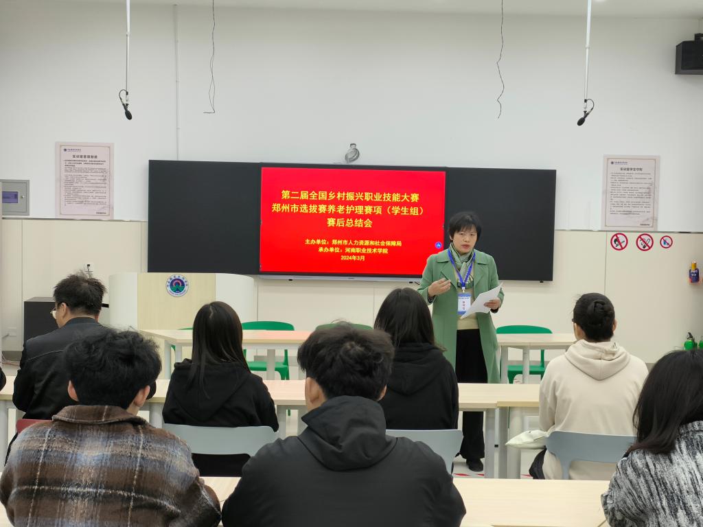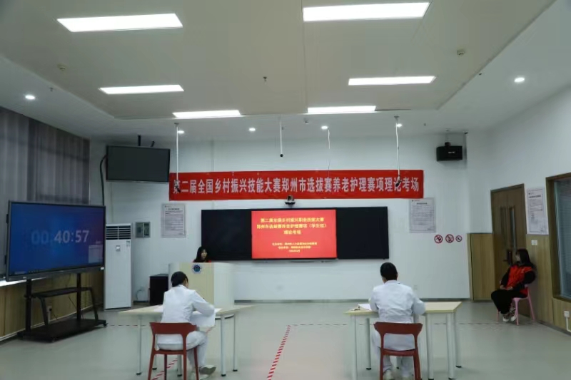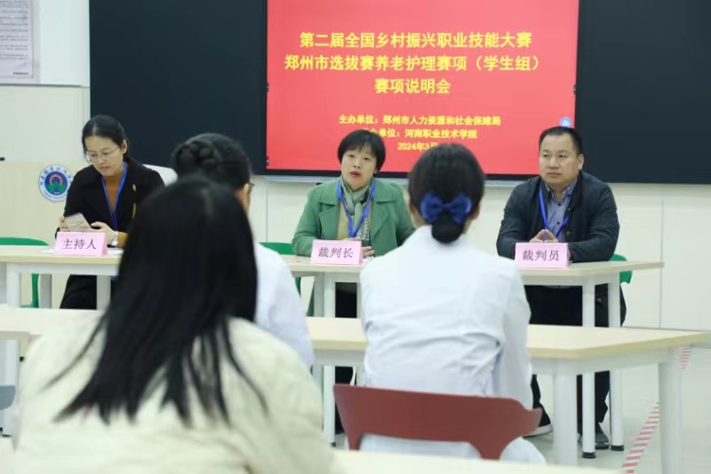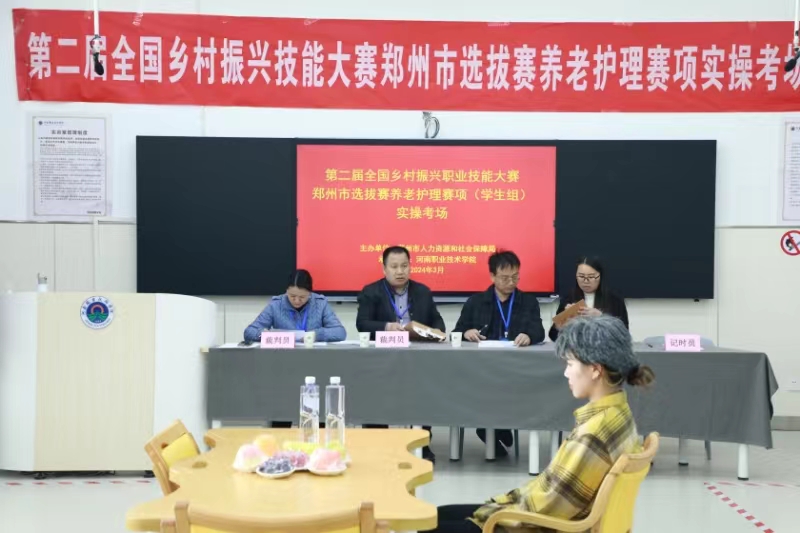 3月14日下午,由郑州市人力资源和社会保障局主办、河南职业技术学院承办的第二届全国乡村振兴职业技能大赛郑州市选拔赛养老护理赛项(学生组)在合鼎楼9楼智慧健康养老服务与管理专业实训室成功举行。