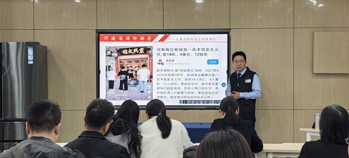 讲座上,蔡教员结合近年来发生火灾的视频案例和图片,分析了日常生活中用电、燃气、办公室设备等火灾处理特点,并从社会消防四个能力建设、火灾的扑救方法、引发火灾的因素、如何正确报火警、逃生与自救以及消防安全注意事项等六个方面进行了具体讲解。