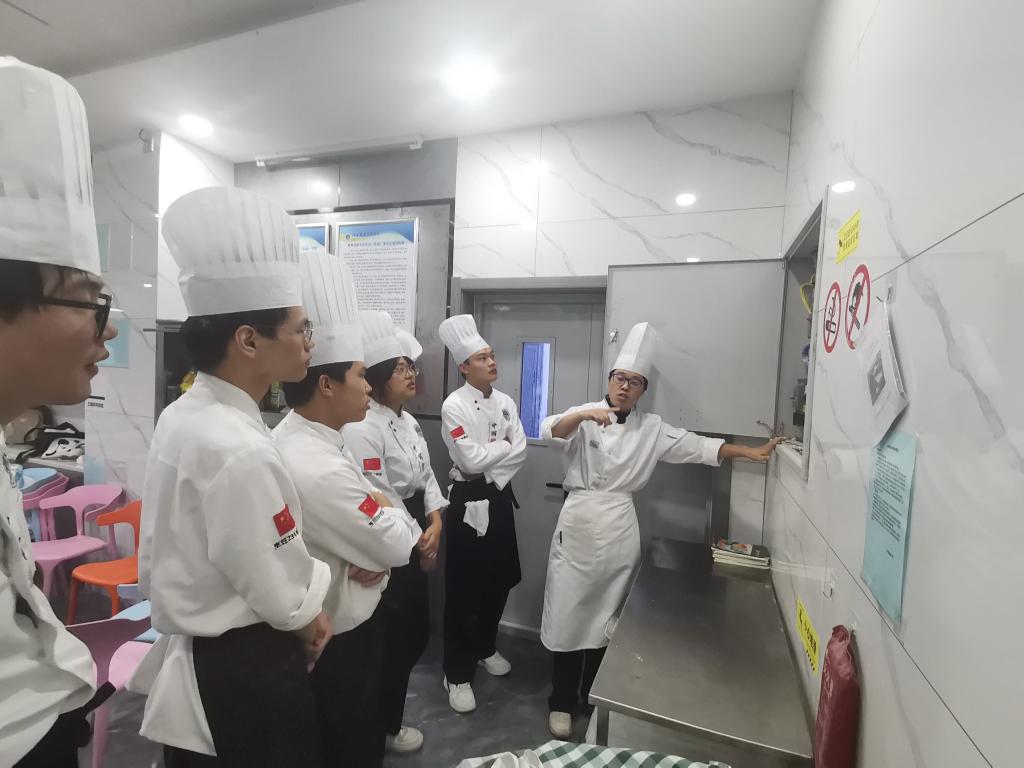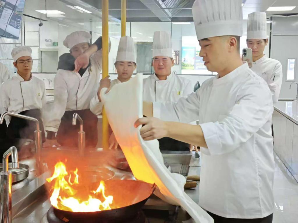 烹饪工艺与营养教研室教师马军卫在健行楼103室,带领学生现场模拟油锅起火时灭火毯的使用方法,并强调了初期火灾处置、灭火设备使用要点和逃生自救的基本知识。