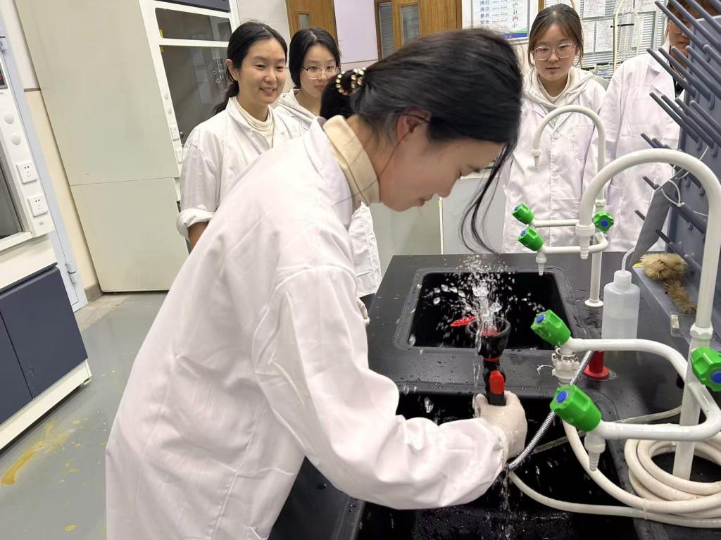 实训中心主任李少华在合鼎楼910室,带领学生现场模拟酸碱试剂溅入眼睛时的应急处理,指导学生如何正确使用洗眼器,强调做好日常安全检查和规范操作的重要性。