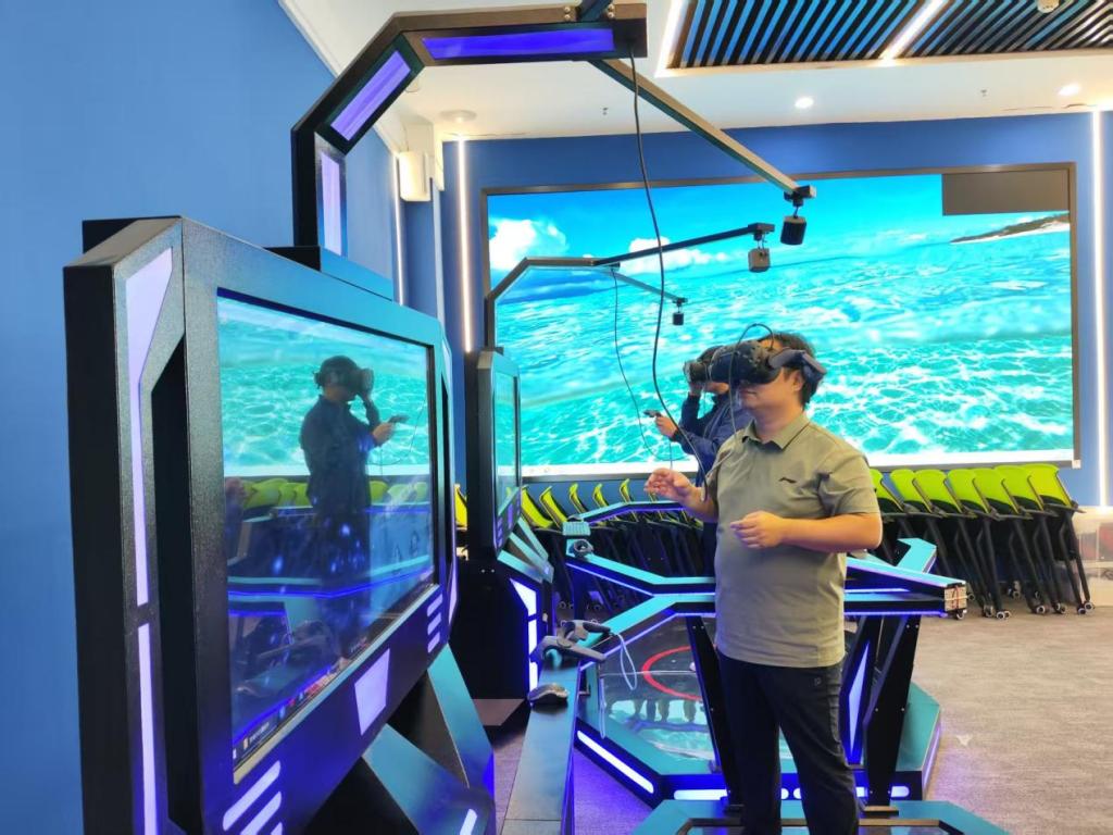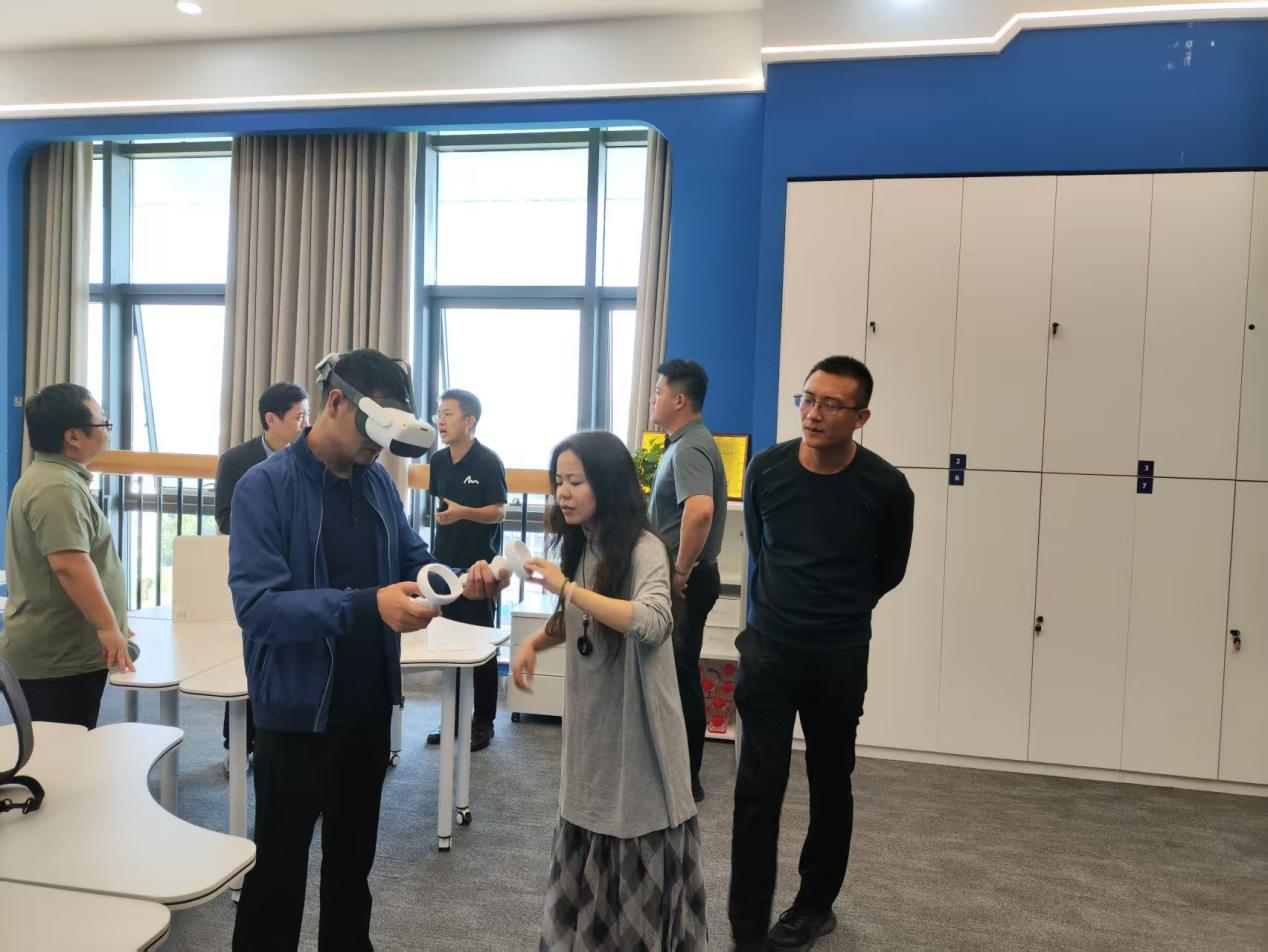 会后,田其英一行参观了我院食品分析实训室、微生物实训室、基础化学实训室,并亲身体验了沉浸式VR交互行走平台在虚拟仿真教学中的应用效果。