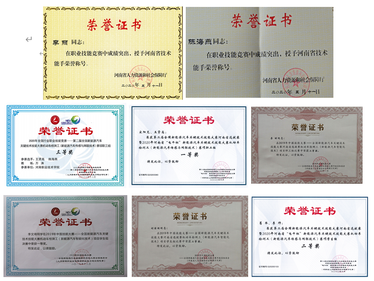 专业成立以来,师生在近几年的智能网联汽车相关大赛中屡创佳绩,本专业教师李丽、陈海燕获得了“河南省技术能手”荣誉称号,并先后参加了全国新能源汽车关键技术技能大赛新能源汽车智能化技术和新能源汽车传感与网联技术赛项,取得了国赛三等奖1个、省赛一等奖1个和二等奖1个。指导学生参加了全国新能源汽车关键技术技能大赛新能源汽车智能化技术和新能源汽车传感与网联技术赛项,取得了国赛一等奖1个、省赛二等奖2个。