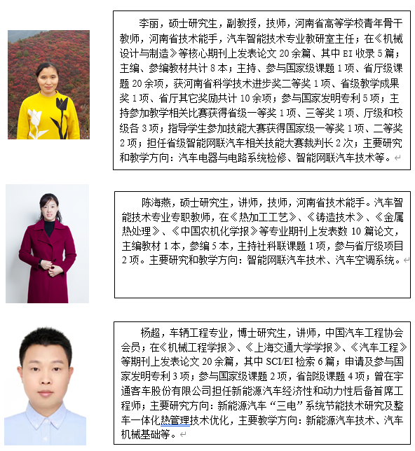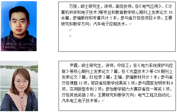 汽车智能技术专业教研室共有教师5人,其中副教授1人,讲师4人;博士1人,硕士4人;团队中3人具有技师以上职业资格证书,1人具有工程师证书,“双师型”教师比例80%。团队人员结构合理,由年富力强、精力充沛、具有丰富教学和实践经验的硕士、技师组成;团队成员学科涉及车辆工程、机械工程、电子等学科,学科结构合理;教学队伍稳定,素质高,具有很强的刻苦钻研能力和教学创新精神。