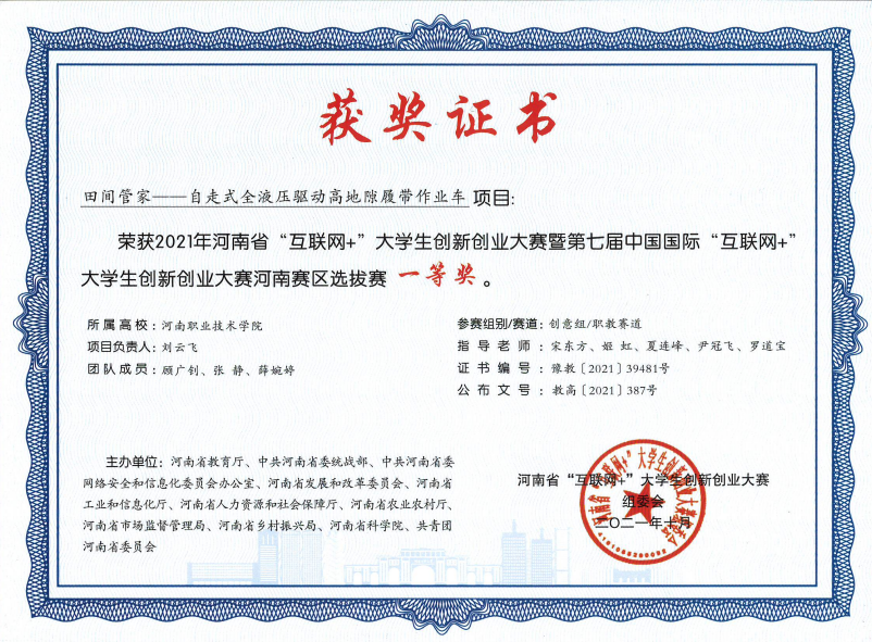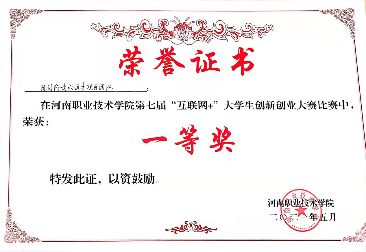 2021年车身专业教师指导学生参加河南省“互联网+”大学生创新创业大赛暨第七届中国国际“互联网+”大学生创新创业大赛河南赛区选拔赛一等奖;
