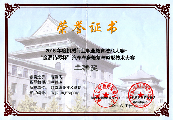 2018年车身专业学生获得第45届世界技能大赛车身修理项目河南省选拔赛二等奖;