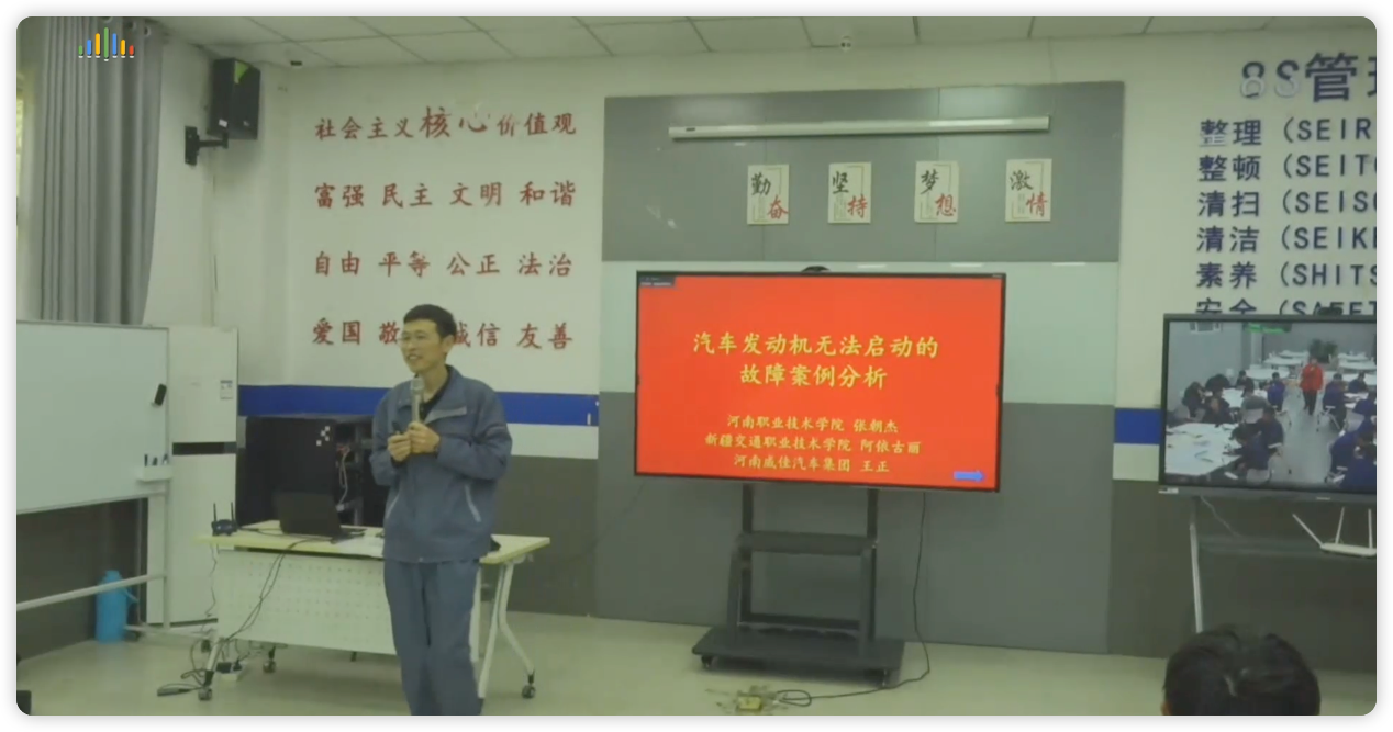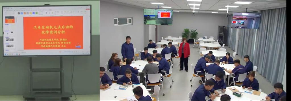 课堂上,张老师带领同学们,首先对汽车发动机无法启动的故障案例进行理论分析相隔千里的两校学生实时交流、积极互动,课堂气氛融洽。随后,王总监将企业生产过程中遇到的汽车发动机无法启动的具体案例引入课堂,以其专业、高超的技能赢得了同学们的一致好评,使产教融合落实到课堂中。阿依古丽老师则带领两地学生,结合不同车型和手册,引导学生进行深入思考,有效推动学生可持续发展能力。