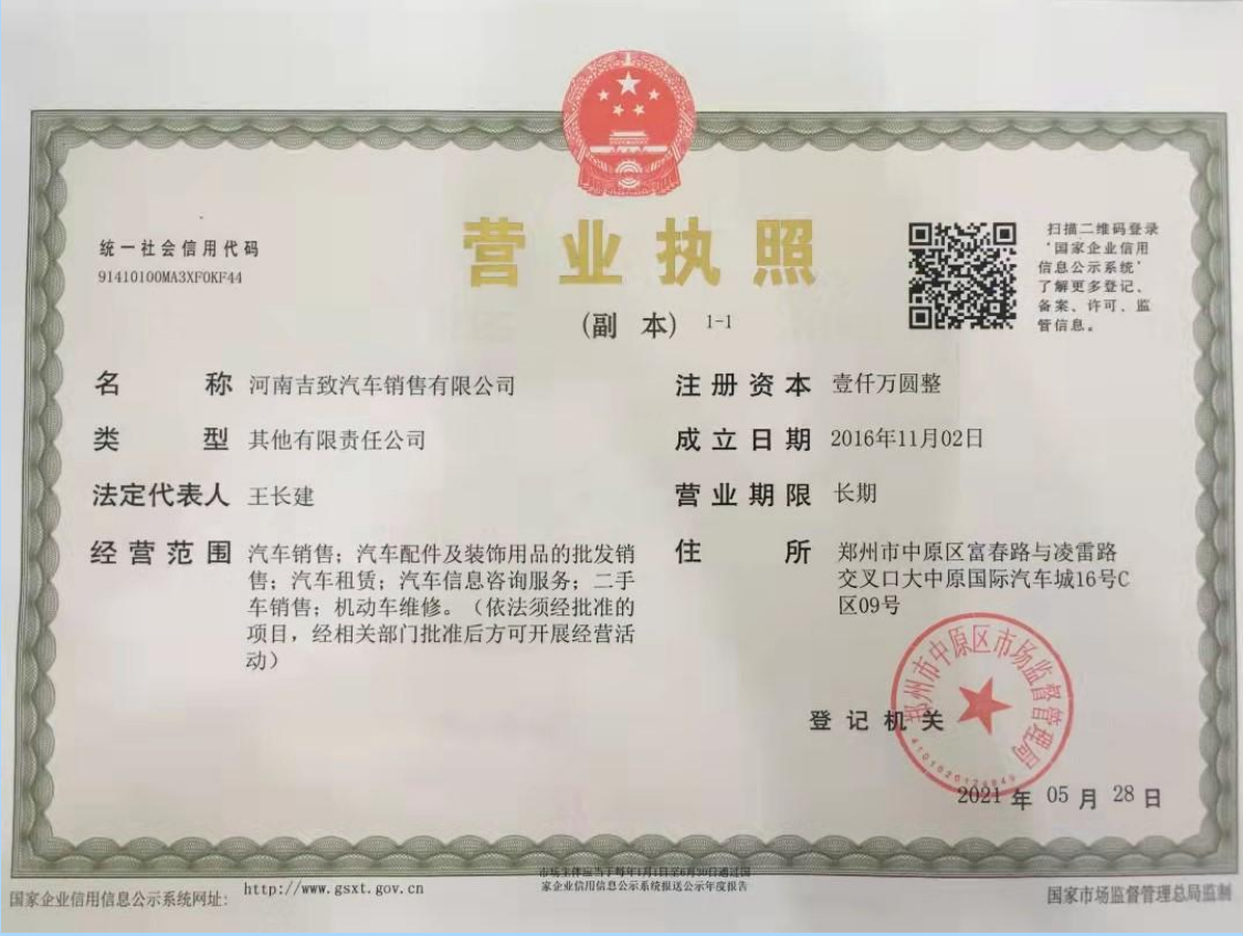 河南吉致汽车销售服务有限公司隶属河南海川集团,是吉利集团在华中地区指定(吉利)汽车特约店。是集吉利品牌整车销售、售后维修、原厂配件供应及信息反馈于一体的综合性配套服务公司。吉致吉利旗舰店位于郑州市中原区大中原国际汽车城 C区 16 号,总投资规模上千万元,在职员工近 100 人,展厅面积 3600 平方米,是吉利汽车在河南地区授权的首家 S 级超豪华旗舰店。目前经营品牌:吉利新帝豪、帝豪 GL、博瑞 GE、新博瑞、博越、新远景、远景 X1、缤越、星越、豪越、吉利 icon等车型。