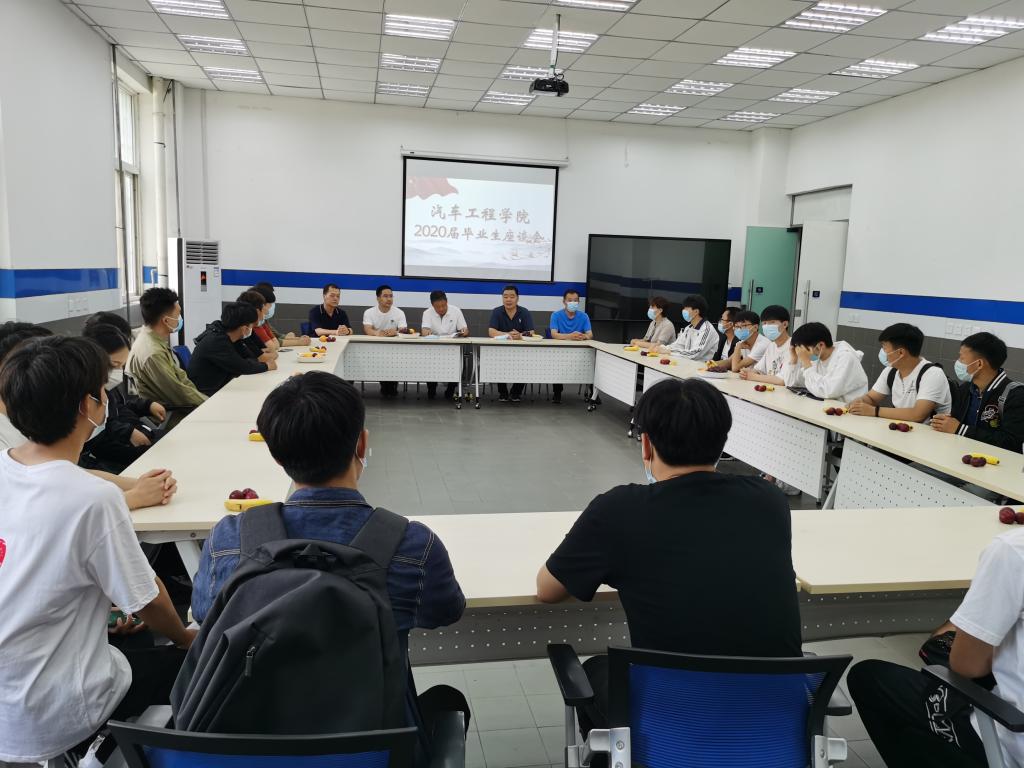 6月18日上午,汽车工程学院在实训楼103教室举行2020届毕业生座谈会,学院院长胡勇、党总支书记朱梦杰及学院全体班子成员及25名2020届各专业毕业生代表参加本次座谈会。
