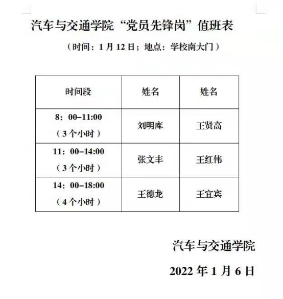 根据上级疫情防控有关精神,汽车与交通学院党组织积极行动,动员广大党员踊跃报名学校南大门“党员先锋岗”值班活动,争先冲锋在疫情防控斗争第一线,以自己的实际行动践行党员的初心使命,为学校坚决打赢新冠肺炎狙击战积极贡献力量。结合学校疫情防控工作需要,我院共安排六名“党员先锋”于1月12日参与了本次活动。