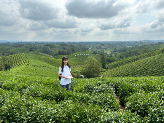 走进文新茶园,远远眺望,茶树一个接一个地在山头连绵起伏,犹如绿色的地毯铺在山间。目之所及都是茶树,它们围着山头,一圈又一圈地盘旋而上,仿佛一条一条“绿丝带”围绕茶山,高低起伏地排列在一起。修剪过的茶园整齐而条理,茶叶格外翠绿,茁壮成长。