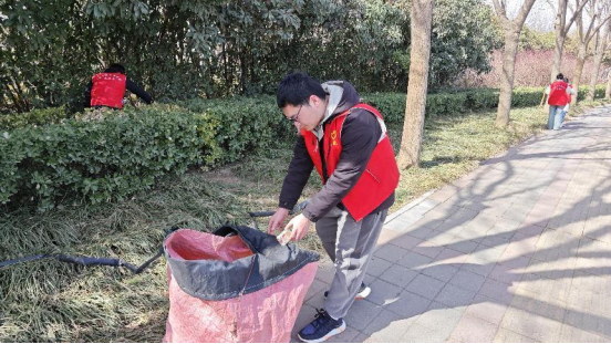 第二站,党员志愿者来到龙子湖北路开展环境卫生大扫除。志愿者们积极行动,分工协作、相互配合。时而穿行在草地中,捡拾散落的纸巾、烟头,时而转到树林中清理丢弃的塑料瓶、垃圾袋等垃圾,发扬不怕脏不怕累的奉献和劳动精神。