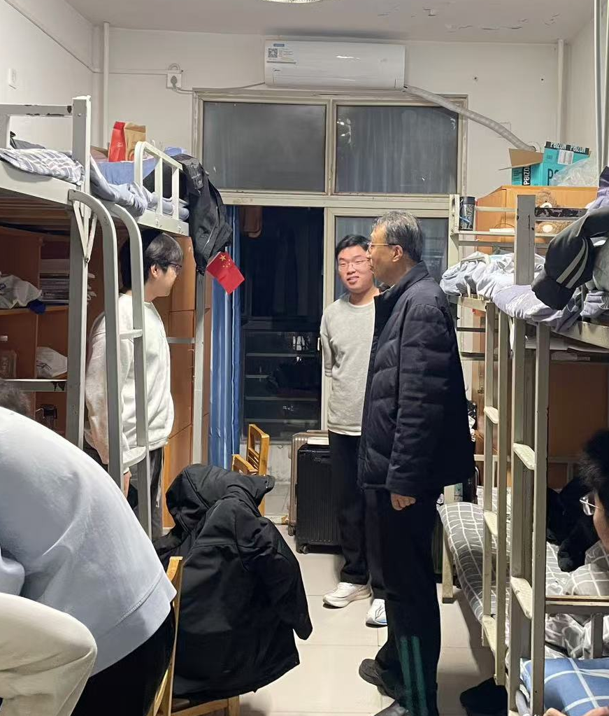 12月25日晚上,吉武俊深入学生宿舍,逐一查看宿舍环境,细致入微地了解学生的生活点滴。每到一处,他都与学生们亲切交流,关心他们能否适应集体生活,耐心询问是否遇到棘手难题。“大家生活上都还习惯吗?要是有难处,一定要跟学校讲。”一句句贴心的问候,瞬间拉近了师生距离。同时,他反复叮嘱学生们务必将宿舍安全牢记心间,倡导同学们培养良好生活习惯,早睡早起、整理内务,携手打造积极向上的宿舍文化氛围。